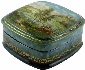 The exterior of the box is covered with green oils of different shades that tone with the composition painted mostly in green tones. The box's interior is traditionally red. Beautiful gold ornamentation decorates the edges of the lid, and the box's sides.