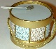This original box repeats the shape of a drum. Its upper part is removable, and supplemented with a pair of three-dimensional drumsticks. The sides of the upper part of the drum as well as the sides of its bottom part are covered with metallic gold paints. The sides of the middle part of the drum's body are covered with blue, red and gold tartan patterns. The cord is attached to the drum's body with the help of gold metal loops, so the drum can be hung.