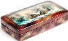 The box is constructed from paper-mache. The lid is hinged from the top of the composition, and the box rests on a flat bottom. The work is signed with the artist's name, the village of Fedoskino, and the year of 2005.