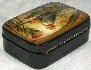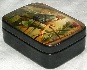 Description: This alluring box that shows the old elf sitting on the grass and thinking about something is an original work of Natalya Lavrenkova. This talented Fedoskino artist likes to paint her boxes on various fairy-tale themes. Green tones of oils dominate here. Black lacquer is used to paint the exterior of the box while red lacquer completes the interior of the work.