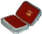 The box's exterior is covered with soothing light blue paint, and decorated with gold blurry spots. Its interior is traditionally covered with red lacquer. The Fedoskino "troika" insignia can be found on the interior of the lid.