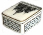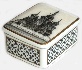 Rogatov has painted the architecture of the cathedral in dark grey tones of oils against the cream background. Cream tone has been also chosen to cover the box's exterior while the interior is traditionally covered with red lacquer. The box's sides are decorated with elegant tartan patterns painted in dark grey and green oils and outlined with gold. Gold is also used to decorate the edges of the box.
