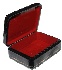 The box is constructed from paper-mache. Black lacquer is used to paint the exterior of the box while red lacquer completes the interior of the work. The edges of the lid are decorated with a golden pattern. The lid is hinged, and the box rests on a flat bottom. The work is signed with the artist's name and the year of 2010.