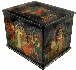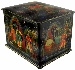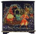 The box is painted in the traditional Palekh style. Bright, vivid colors burn against the black background. Lustrous gold metal paints are used to paint the stars, the moon, light in the windows, and also to detail the characters' costumes, the snow, and a lot of other details.