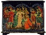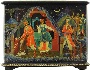 Description: This splendid piece of Russian artistry was painted by the talented Palekh artist S.A. Molkov. It shows several scenes from the N.V. Gogol's literary work "The night before Christmas". This work was included into the famous book of collected stories called "The Evenings in the Village situated not far from Dikanka" written by the same writer. This book was created in the beginning of the nineteenth century and at once became the best seller. It was composed of mystical fairy-tales and horror stories written in the folk style. Creating this literary work Gogol discovered a new style in Russian literature. Telling his horror stories, he described folk traditions and customs of the Ukrainians and praised the beauty of Ukrainian nature that was his motherland.