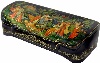 This paper-mache box is elegantly designed and has the slopping lid. Black lacquer is used to paint the exterior of the work while red lacquer completes the interior of the piece. As customary with Palekh tradition, the black lacquer exterior also acts like the background for the scene. This feature brings added life to the forest surroundings, making them a natural stage for the drama at hand. A hinge has been fastened above the composition to be used for ease of opening. The lid's artistry has been framed with a string of golden beads. All four sides have been decorated with a golden filigree pattern that glows radiantly. Crisp aluminum wild flowers accentuate this golden filigree. The box rests upon four feet. The artists wrote their last name and first initials, the village name of Palekh and the year of 2005 of which the piece was finished along the bottom of the composition in gold paint.