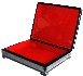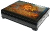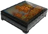 The box is constructed from paper-mache. Black lacquer is used to paint the exterior of the box while red lacquer completes the interior of the work. The lid is hinged to the top of the scene, and the box rests on a four legs. The work is signed with the artist's name in the corner of composition.