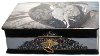 The box is constructed out of paper-mache made in the village of Fedoskino. Black lacquer covers the exterior and red lacquer covers the interior of the box. There are intricate decorations on all sides of the box. The box has a hinge to its top and rests on a flat bottom. The box has a lock and it is working very well!!! (Key is included). The box is signed and dated (1991, 2007) by the artist.