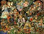 In the center of the composition there are main characters of this tale: the miller's youngest son and his cat. In the right upper corner there is the scene featuring the cat is sit in front of real magician and saying him, that the cat is won't believe that such a big magician can turn into a little mouse...