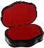 The box is constructed from paper-mache. Black lacquer is used to paint the exterior of the box while red lacquer completes the interior of the work. The box has a hinge from the top of the scene, and rests on wavy legs. The work is signed by the artist.
