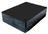 The box is constructed from paper-mache. Black lacquer is used to paint the exterior of the box while red lacquer completes the interior of the work. The box is hinged at the top of the composition and rests on four round legs.