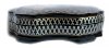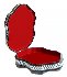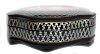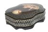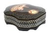 The box is constructed from paper-mache. Black lacquer is used to paint the exterior of the piece while red lacquer completes the interior of the box. The lid is hinged from the top of the composition, and the box rests on a wavy platform with several legs.The work is signed by the artist.