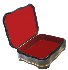 The box is constructed from paper-mache. Black lacquer is used to paint the exterior of the box while red lacquer completes the interior of the work. The lid is hinged from the top of the composition, and the box rests on four legs. The work is signed with the artist's name.