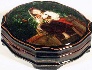 Description: The box is made out of paper-mache. Tiny gold beads frame the ova scene; the edges of the lid are adorned with complex patterns consisted of a brown band painted in oils and vines of gold flowers and tiny gold beads that twin around this band. The sides are covered with the brown broad pattern that looks like sprayed brown oils; this pattern is covered with gold and black dots and spots and imitates stone. The sides are also decorated with beautiful gold floral patterns and brown bands. The box has a hinge from the left of the composition and rests on four legs. Black lacquer covers the exterior and red lacquer covers the interior of the box. The box is signed with the artist's name (Letyagina N.), village (Fedoskino) and year (2001).