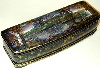 The box is constructed from quality paper-mache. The interior of the box is covered with red lacquer, the box's exterior is covered with black lacquer mixed with metal gold and metal blue spangles. The lid is hinged from the top, and the box rests on four legs.