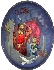 Most of the composition is painted in blue tones except for the figure of Sadko and the sails painted in red and brown tones. Mother-of-pear shines through the sails and the costume of Sadko. Gold paints are used to detail the ship, to decorate the costumes of the characters, and to highlight the flag fluttering on the top of the ship's mast.