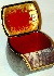 The scene is framed with the wide gold ribbon. The exterior of the box is light gray, and studded with a multitude of dark gray veins. The box's interior is red; the edges of the lid's red interior are decorated with bright gold metal paint.