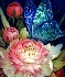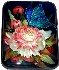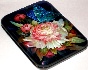 Description: This strikingly beautiful box is a creation of Oleg Gavrilov from the village of Fedoskino. It shows the blue butterfly sitting on the white-pinkish peony flower. Mother-of-pearl creates magic brilliance of the butterfly's wings. Black background has been chosen to strengthen the colors. Painting numerous petals, fresh green leaves, pink, ready to bloom buds; and skillfully combining various shades of pink, white, green and blue the artist has managed to reproduce realistically the magnificent bouquet that seems to emanate delicate aroma.