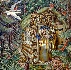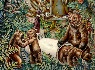 The level of depth and color is so intense that one simply cannot stop staring at this composition. The palette includes various shades of green and brown suitable for depiction of the forest setting. The action within the scene is so animated that one almost expects the images to start moving. By keeping the action very close up, the viewer gets the most intimate possible portrayal of the subjects. By doing this the artist must provide tremendous detailing, which he achieves in amazing fashion. The shadows, blending of paints, and razor sharp lines that are consistent throughout the composition, are made to work together by this artist who creates a fun and original painting.