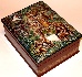 A deep blue above the trees shows the moonlit sky, which is illuminated by a mother-of-pearl moon. Mother-of-pearl inlays also appear in the hut's legs, in the window, and in the Baba Yaga's dress. Gold and aluminum are used to enhance the colors' quality, as well highlighting the bulk of the details. The gold and aluminum are found all over the landscape, in the trees, bushes, animals and ground. This illumination coming from within the scene makes the scene glow and permanently affixes the eyes to its dynamic beauty. Gold metal leaf is also used here to decorate the foliage of the trees and bushes.