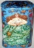 Description: Galina Abramova is a talented Fedoskino artist who painted this interesting work that is called "The Queen of Hares". The whole surface of the box (except its exterior bottom and interior) is covered with colorful painting. Here we can see the Queen of Hares whose skirt is made of cabbage leaves, the hares gathered around the basket filled with ripe apples, bright multicolored flowers, and apple-trees covered with apples and fresh leaves.
