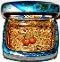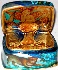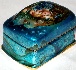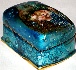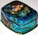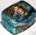 On the box's exterior bottom the artist painted water bubbles again using blue oils and aluminum powder as an underlayer. The box's interior is covered with gold powder, and over this gold area the artist painted various images