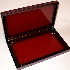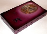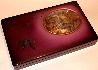 The box is made out of paper-mache. Its red lacquered interior is sprinkled with black paint on the corners. The lid is hinged at the top, and the box sits flat. The work is signed with the artist's name, the year of 2006, and the title ("Flight of Martins").