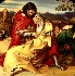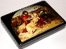 Description: Roman Khokhlov from the village of Fedoskino painted this splendid box. It depicts the knight hugging the dying priest. The scene is painted in bright oil paints; gold paint shines through the knight's red cloak.