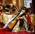 Brown, red and green oils dominate here. Gold metal leaf helps to accentuate richness of the characters' costumes. Aluminum paint creates a light source for the window located in the remote chamber.