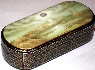 The scene is thinly outlined in gold. The edges of the lid are adorned with a wavy gold pattern. An intricate gold tartan pattern decorates the box's sides.