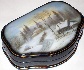 White and blue-gray tones suitable for depiction of a winter scene dominate here. Mother-of-pearl is set into the sky to create a golden glow of the sunset.