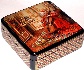 The scene is framed with a gold line. The sides of the box are decorated with red and orange tartan patterns outlined with gold paints.