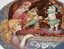 The box shows a girl who watches the puppet show. The composition is multi-layered. This is done by painting one particular portion of the piece, thinly coating it with clear lacquer and then continuing on with the compositional process. By doing this, the artist creates three dimensional depth, perspective and beautiful texture. The depth of the composition is also strengthened by mother-of-pear that is set into the stage scenery in the background. Mother-of-pearl has bright orange and green undertones that suit the rich palette nicely. Gold metal leaf shines through the costumes of some characters. Brilliant gold and silver paints are used to draw the patterns that decorate the area around the stage.
