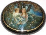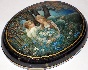 Description: This enchanting Fedoskino box is a creation of Elena Aldoshkina. It shows a young couple having a rendezvous. The scene is painted in blue and green tones characteristic for all Aldoshkina's works. Gold paint is used to highlight the foliage of the tree under the shade of which the couple is sitting, and also to detail some of the plants.