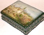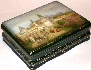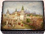 The box is made out of paper-mache. The lid is hinged at top, and the box rests on four legs. The work is signed with the artist's name, Fedoskino, the year of 2007, and the title (“Moscow Kremlin in XVII century”).
