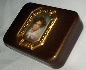 Description: This elegant piece has been created by Lubov Pashinina who is an expert in decoration of lacquer boxes. In the middle of the box there is a portrait of a beautiful lady painted over a shinning piece of mother-of-pearl. The portrait is encompassed with the gold metal frame. The box is covered with brown lacquer mixed with gold powder; tiny and very thin gold veins are scattered against the brown background of the box's exterior except the exterior bottom. The box's interior is covered with the dark crimson velvety material.