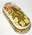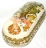 Description: This small charming box that shows a beautiful lady with flowers, has been painted by M. Kubareva. The scene is painted in mustard tones of oils against the cream background. Gold powder shines through the oils, creating a shimmer of the lady's dress, and of some flowers of her wreath. The box's exterior is of appealing cream tone; the sides are decorated with a wide gold band completed with a nice pattern composed of white petals that is painted in oils. Bright gold paint also borders the box's interior edges; the rest part of the interior is traditionally red.
