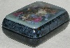 The box's exterior imitates the coloring of a stone (light blue blurry spots and veins are scattered against the black lacquered surface of the box's exterior). The interior is traditionally red.