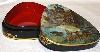 The box is constructed out of paper-mache. Black lacquer covers the exterior and red lacquer covers the interior of the box. The lid isn't hinged, and the box rests on a flat bottom. The work is signed by the author.