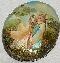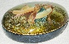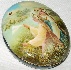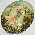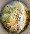 Description: This beautiful box has been painted by Margarita Belova. It shows two Russian peasant girls setting the caged birds free on the meadow. The palette is filled with light greens and blues. Silver paint shines through the oils creating brilliance of the girl's sarafans. Gold paint is used to detail their sarafans.
