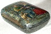 The box is constructed from paper-mache. A hinge is fastened to the left of the scene, and the box rests on a flat bottom. Signed with the artist's name, and the village of Fedoskino.
