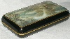 The box is constructed from paper-mache. The lid is hinged from the top of the scene, and the box rests on a flat bottom. The work is signed with the artist's name, and the village of Fedoskino.