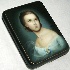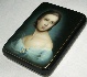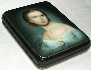 The box is constructed from paper-mache. Black lacquer is used to paint the exterior of the box while red lacquer completes the interior of the work. The lid is hinged from the left of the portrait, and the box rests on a flat bottom. The work is signed with the artist's name and the village of Fedoskino.