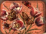 The box's lid, and its exterior bottom show bright butterflies hovering over red tulips. The same butterflies and tulips can be found decorating the box's interior.