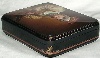 The box is constructed from paper-mache. Black lacquer is used to paint the exterior of the box while red lacquer completes the interior of the work. A hinge is fastened to the left of the scene, and the box rests on a flat bottom. The work is signed with the artist's