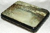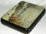 The box is constructed from paper-mache. Black lacquer is used to paint the exterior of the box while red lacquer completes the interior of the work. A hinge is fastened to the top of the scene, and the box rests on a flat bottom.
