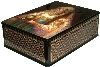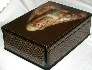 The box is made out of paper-mache. Black lacquer covers the exterior and red lacquer covers the interior of the box. The box has a hinge from the left of the scene, and rests on a flat bottom. Sides of a box are painted with a scottish chequered!