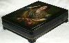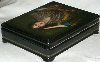 The box is constructed from paper-mache. Black lacquer is used to paint the exterior of the box while red lacquer completes the interior of the work. A hinge is fastened to the left of the portrait, and the box rests on four legs. The work is signed with the artist's name, Fedoskino and the year of 2008.