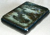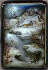The beauty of a frosty winter night has been masterfully expressed here. The palette uses colors that provide the viewer with a realistic, photo-quality, composition that leaves one breathless. One piece of mother-of-pearl mixed with silver powder creates a sparkle of the full moon while another one shines through the ice on the river. Aluminum powder helps to produce a sparkle of the snow. Gold paint highlights some of the dry plants, and creates a light source in the windows of the peasant house.