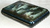 The scene is framed with two parallel gold lines. A gold line can be also found wrapping around the bottom part of the box's sides. Emerald oil paint mixed with aluminum powder covers the edges of the box's sides.